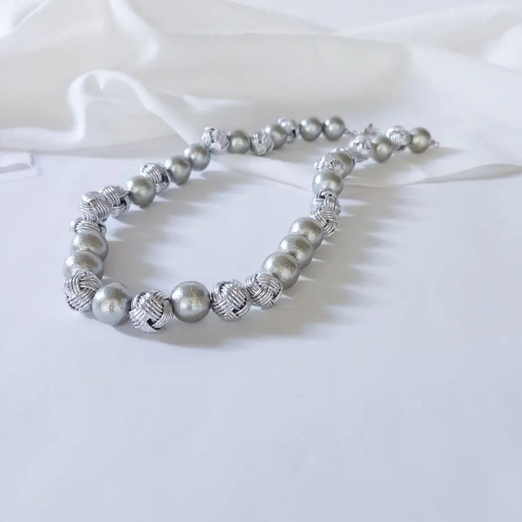 the off-center tamamusubi and the cotton pearls inserted at random create a playful and irregular movement.