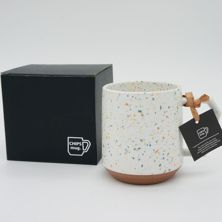 This is an original product brought to you by Chips Inc. The large capacity of 380 ml fits snugly in your hand and allows you to lift it without feeling its weight. We paid particular attention to the clay and glaze, and incorporated playful items that you won't find anywhere else. The packaging is also carefully selected, and each one comes in a box with the Chips Mag logo, making it a great gift. We hope you will try one of the mugs that Chips proudly brings to you. No.C002 CHIPS MUG SPLASH â–A mix of orange, yellow and blue colors are sprayed on a white base. The unglazed part is a brick. It looks simple at a glance, but the fine spray creates a colorful appearance.