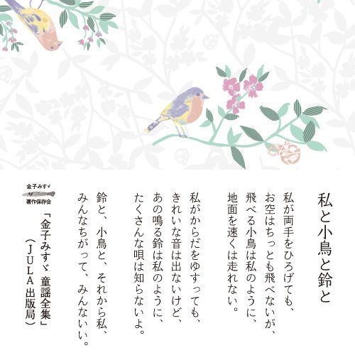 The design is inspired by the poem "Me, a Little Bird, and a Bell" written by the children's song poet Misuzu Kaneko.