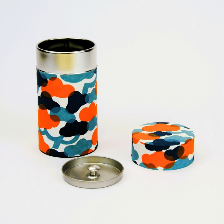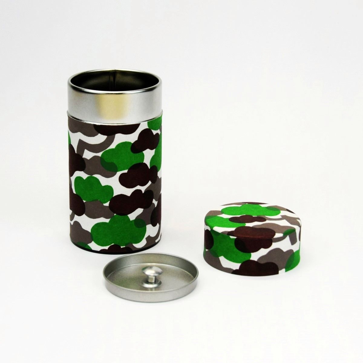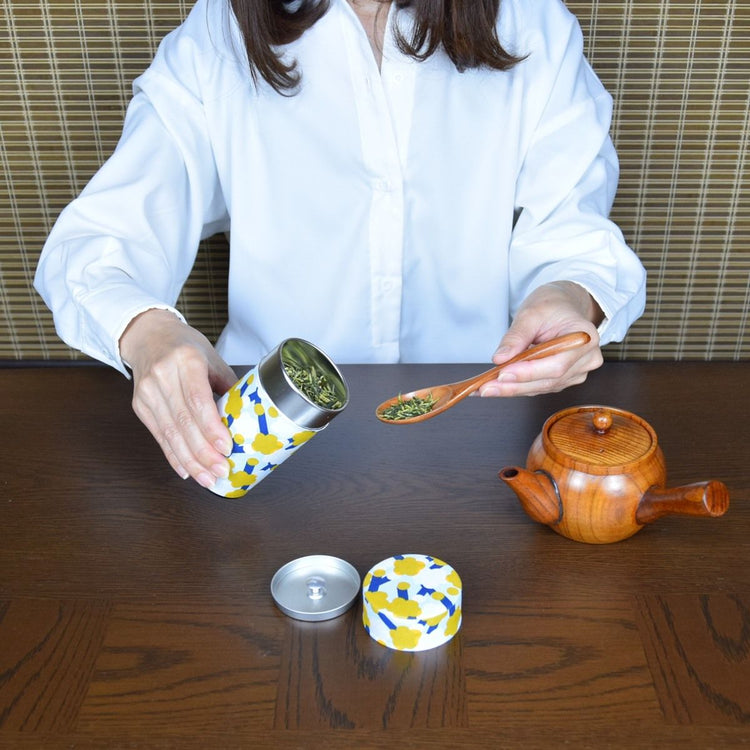 Materials are hand-dyed Japanese paper and paper (plain). The paper is pasted onto tea cans at a factory in Shizuoka, Japan.
