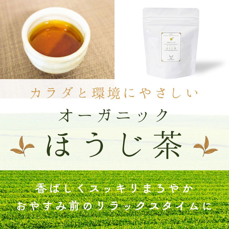 Leaf grade organic hojicha, carefully selected from high quality tea leaves produced in Uji, Kyoto, grown by the power of nature without relying on pesticides or chemical fertilizers, is made into luxurious tea bags.