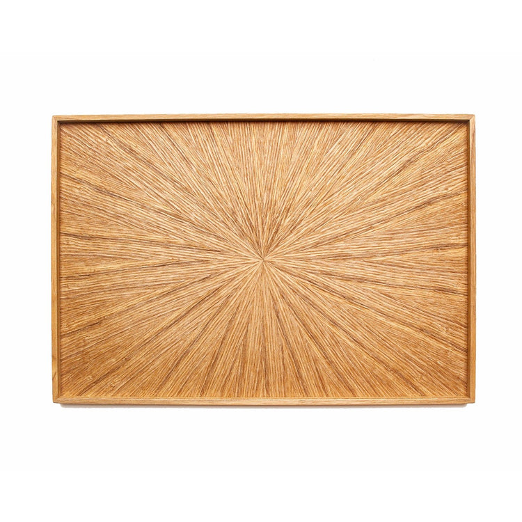 By laminating veneers cut at an acute angle around the center of the tray, the tray looks as if rays of light are coming from the center of the veneer.
