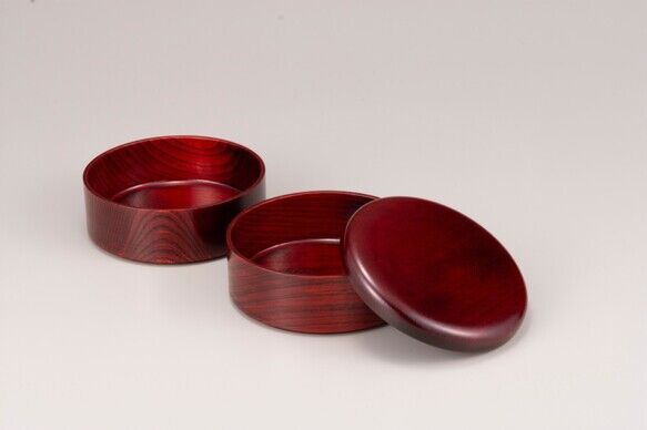 This is a two-tiered round stacked dish with a beautifully grained stopper coated in genuine lacquer.