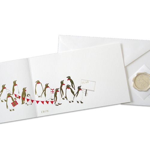This card features a smiling design of 12 penguins getting ready for a birthday party.