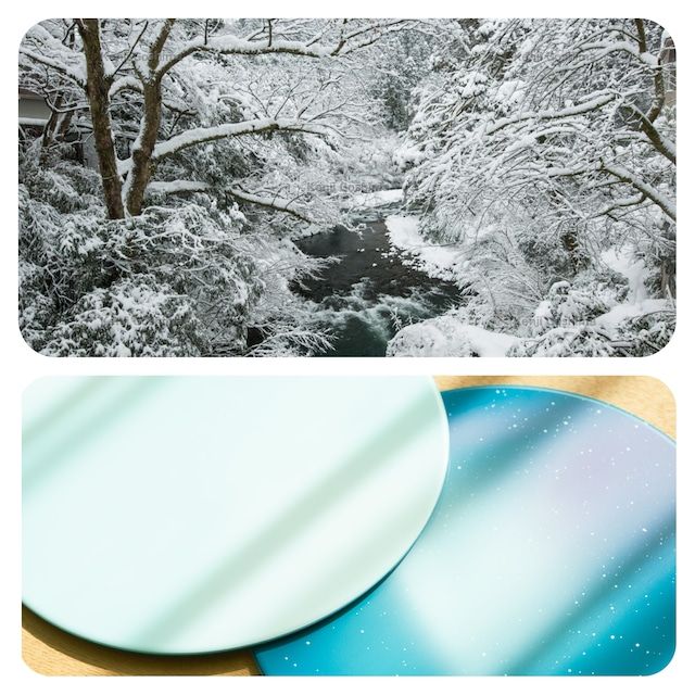 It is painted on both sides with a gradation of white and blue, and a different coating that gives the impression of light shining on the river and snow dancing on the ground. You can use the plate in any color you like.