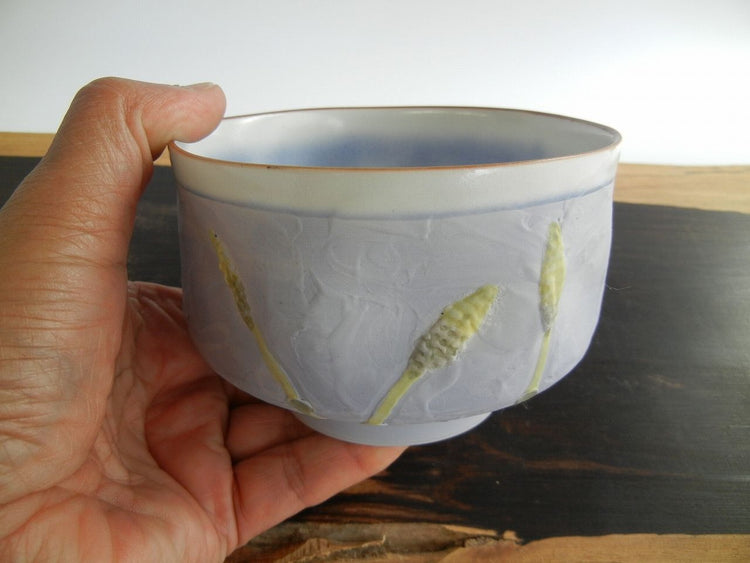 It is reduction fired at 1260 °C. The inside is matte white porcelain.