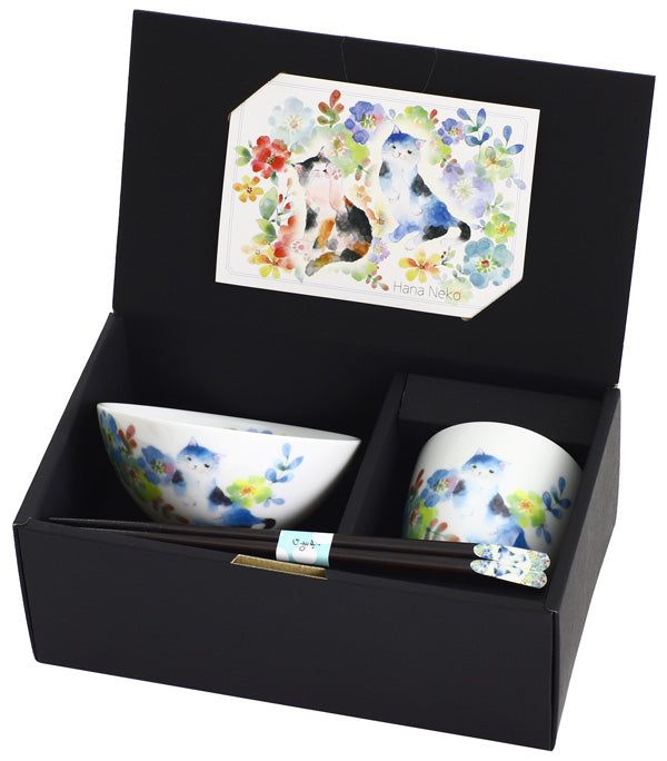 Flower Cat Teacups Blue (with Tenpou chopsticks)(23211)