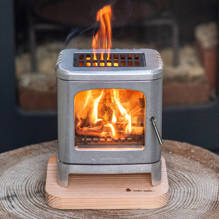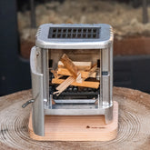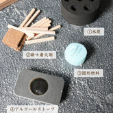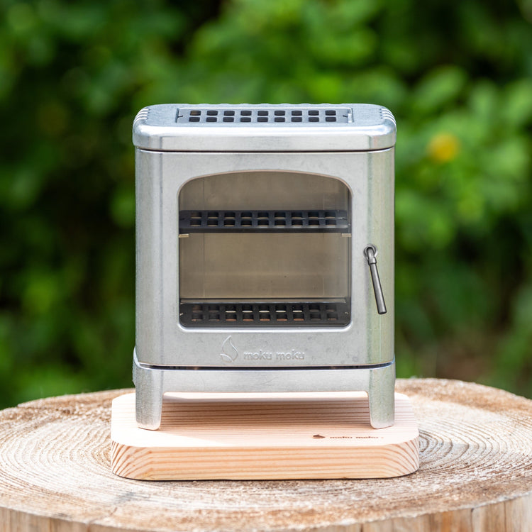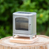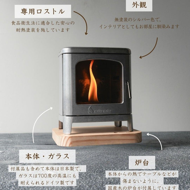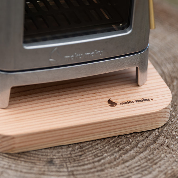 A Japanese wooden hearth is included to prevent damage to tables and other surfaces from heat generated by the main unit.