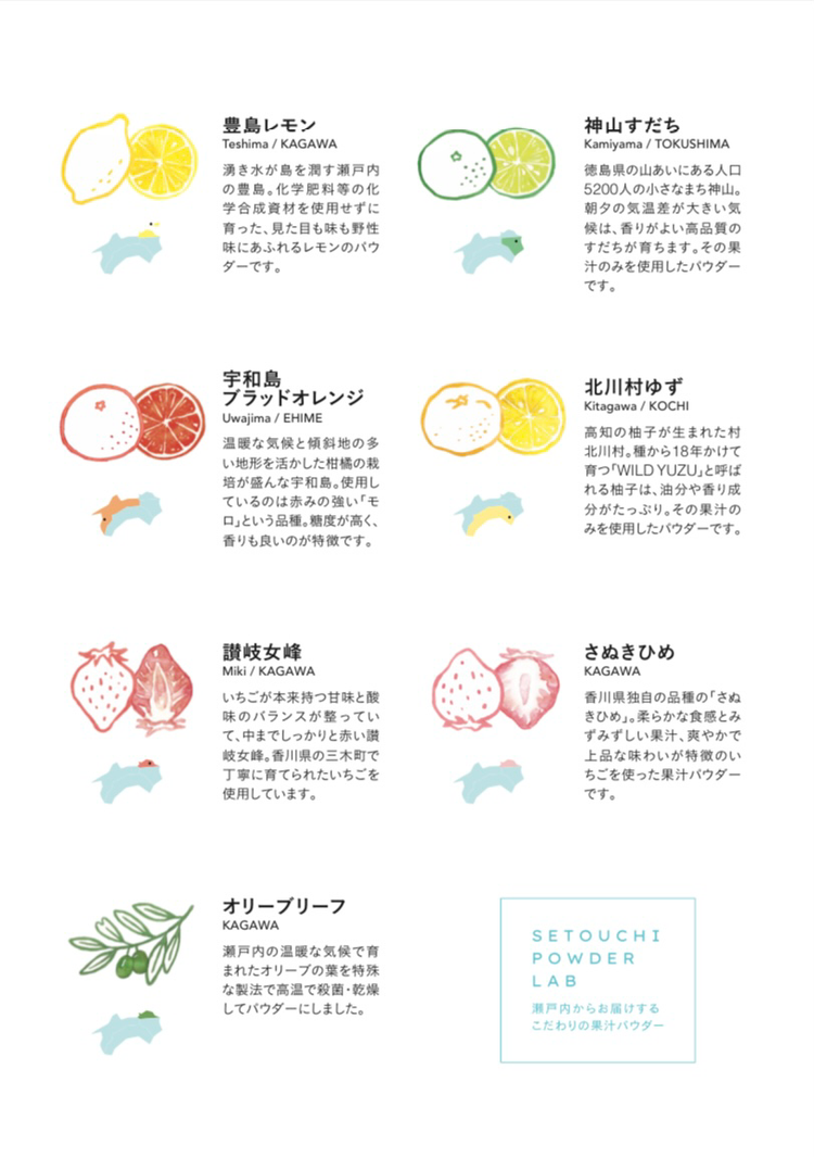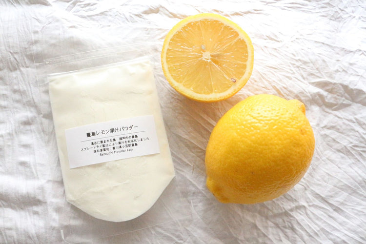 Teshima, a small island in the Seto Inland Sea, has an abundance of clear water springing up from various places at its foot. This spring water moistens the island and brings a rich harvest of lemons and other fruits to the island. Only the juice of the Setouchi Teshima lemons is used to make this juice powder.