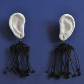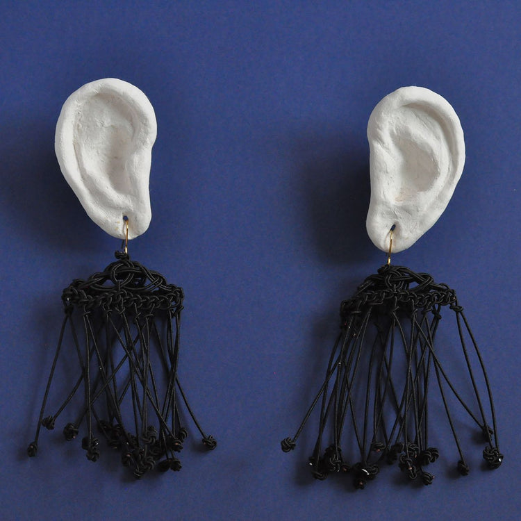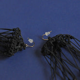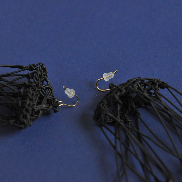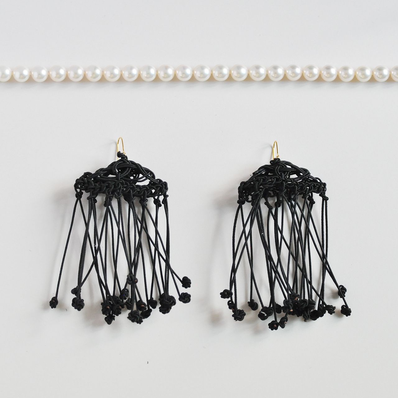 黑色水引在日本通常用於非慶祝性的手袋,在節日場合從來不會出現。然而,這次我們敢於只使用黑色,並創造了耳環,使得形狀不是透過「顏色」而是透過「光」和「影」來感受的。