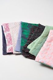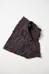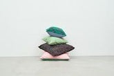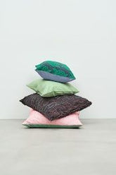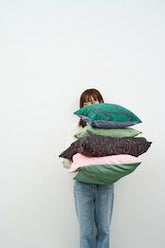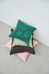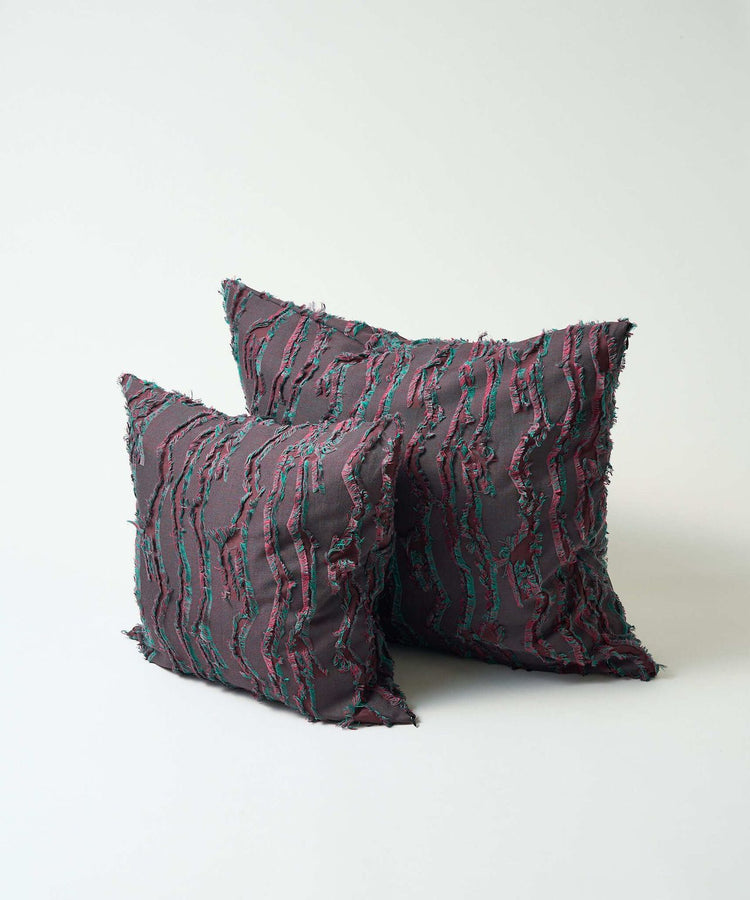 A cut jacquard fabric with a zigzag fringe-like pattern running vertically, using emerald green and purple threads, has been made into a cushion cover. The unique and charming jacquard weave fabric is perfect for accenting your room.