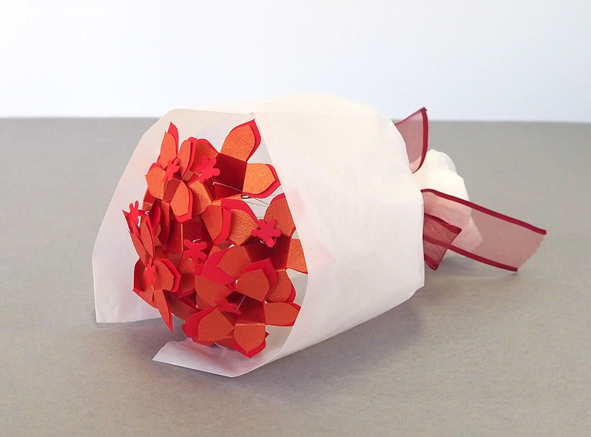 The [petit bouquet] red card is made of paper with a gold luster on one side.
