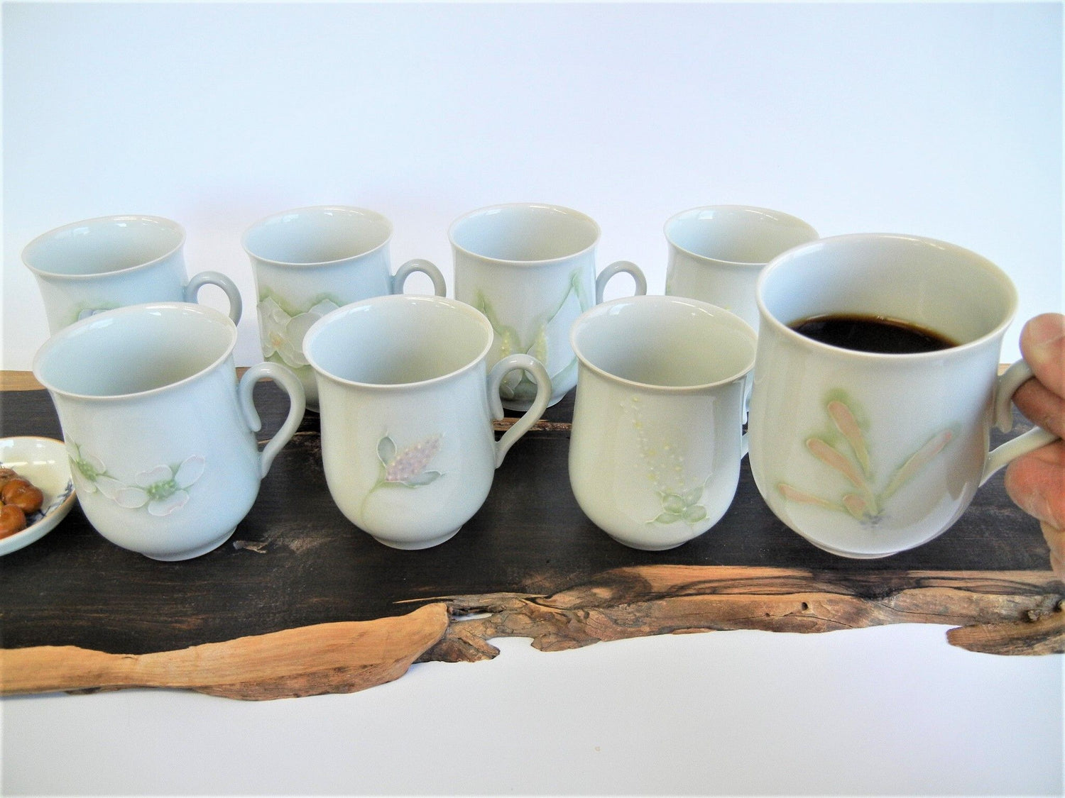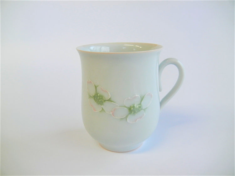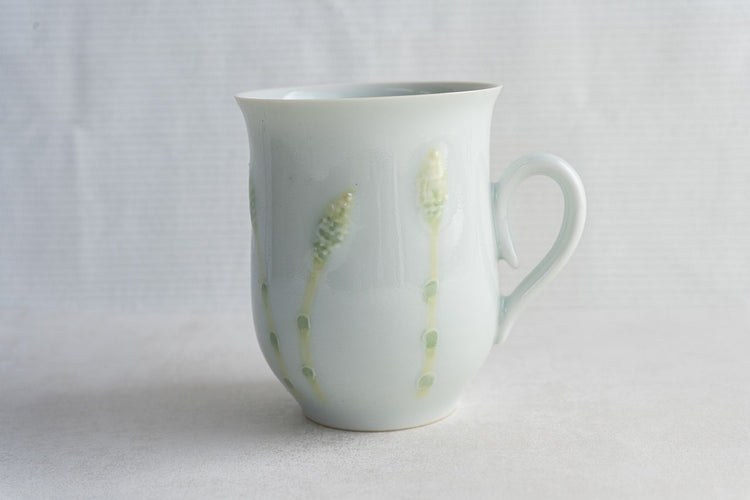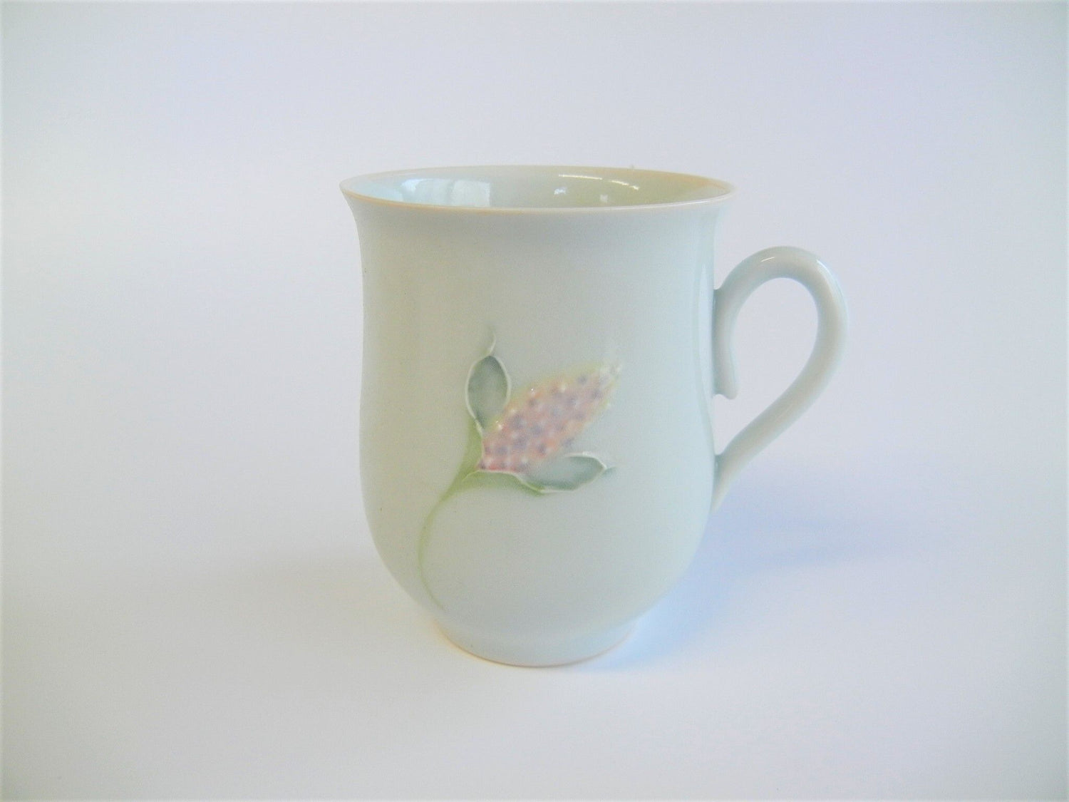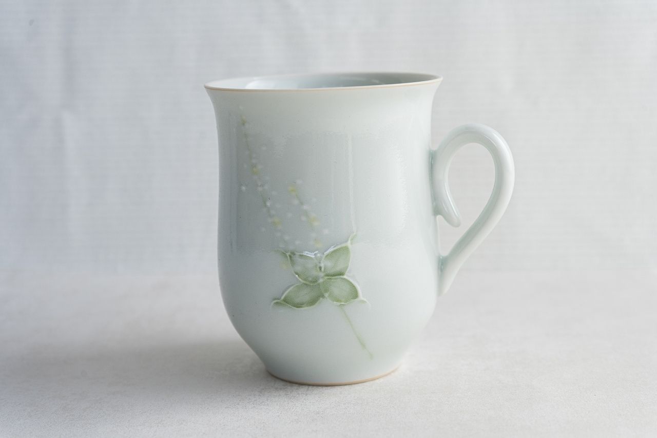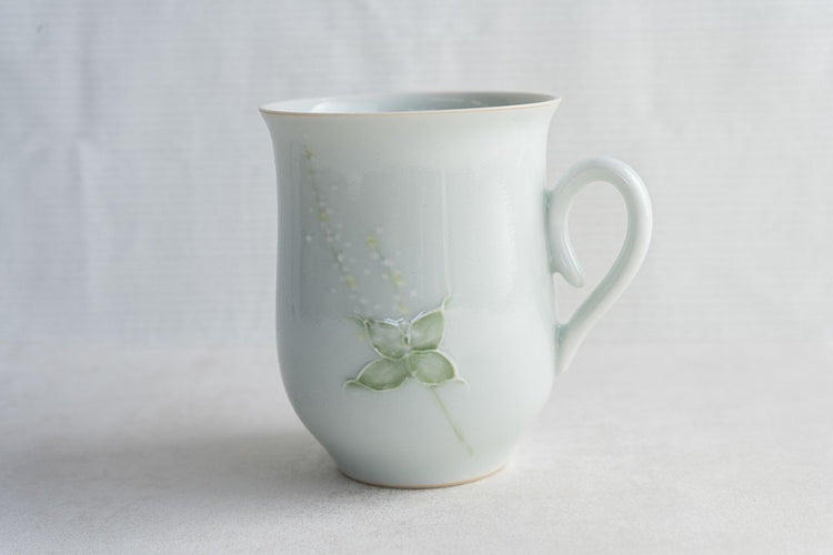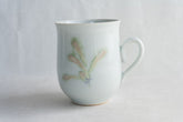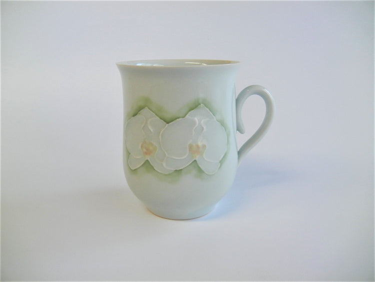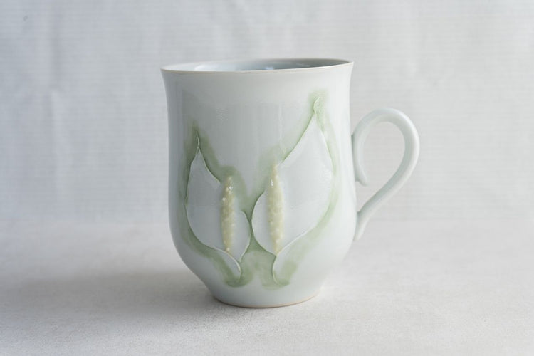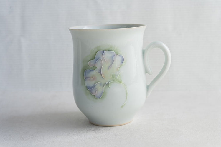 Round-bottomed mug with floral motifs (spring orchid, earthenware brush, skunk cabbage, two people still, swoopy, butterfly orchid, lilac, and flowering water lily)