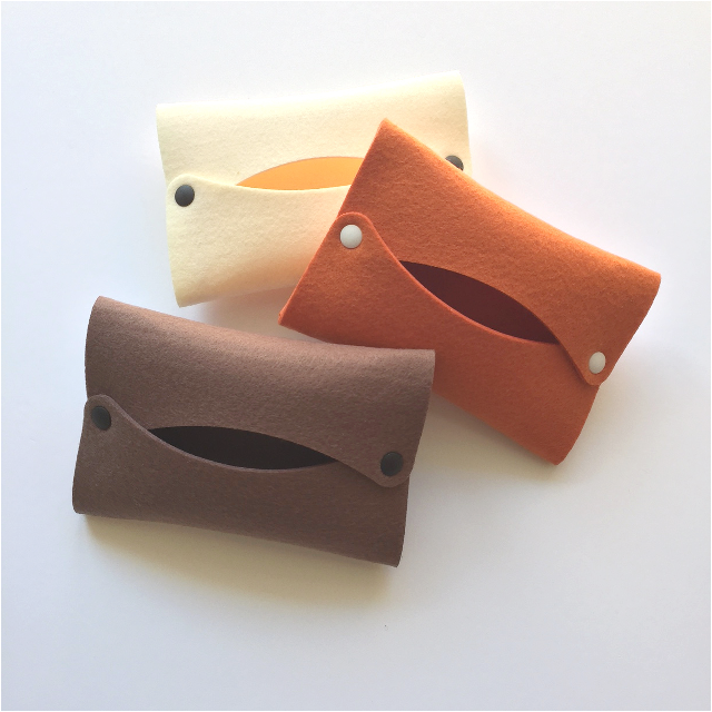 The pocket tissue case (brown) is made by folding a sheet of felt and fastening it with a snap button. It has a comfortable volume as if it swells up in your hand. The felt is washable to make it easy to insert and remove tissues and to keep it clean. The pocket tissue case is a fun and stylish piece of artwork for everyday use.