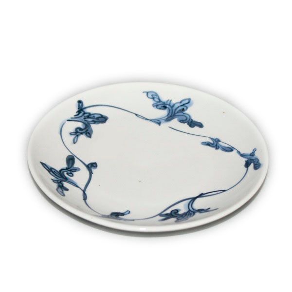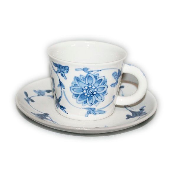 This cup and saucer are decorated with a floral wheel design in underglaze blue. This design was popular in China around the 14th century.