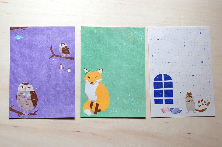 This is a mini letter set featuring forest creatures [owl], [fox], and [squirrel].