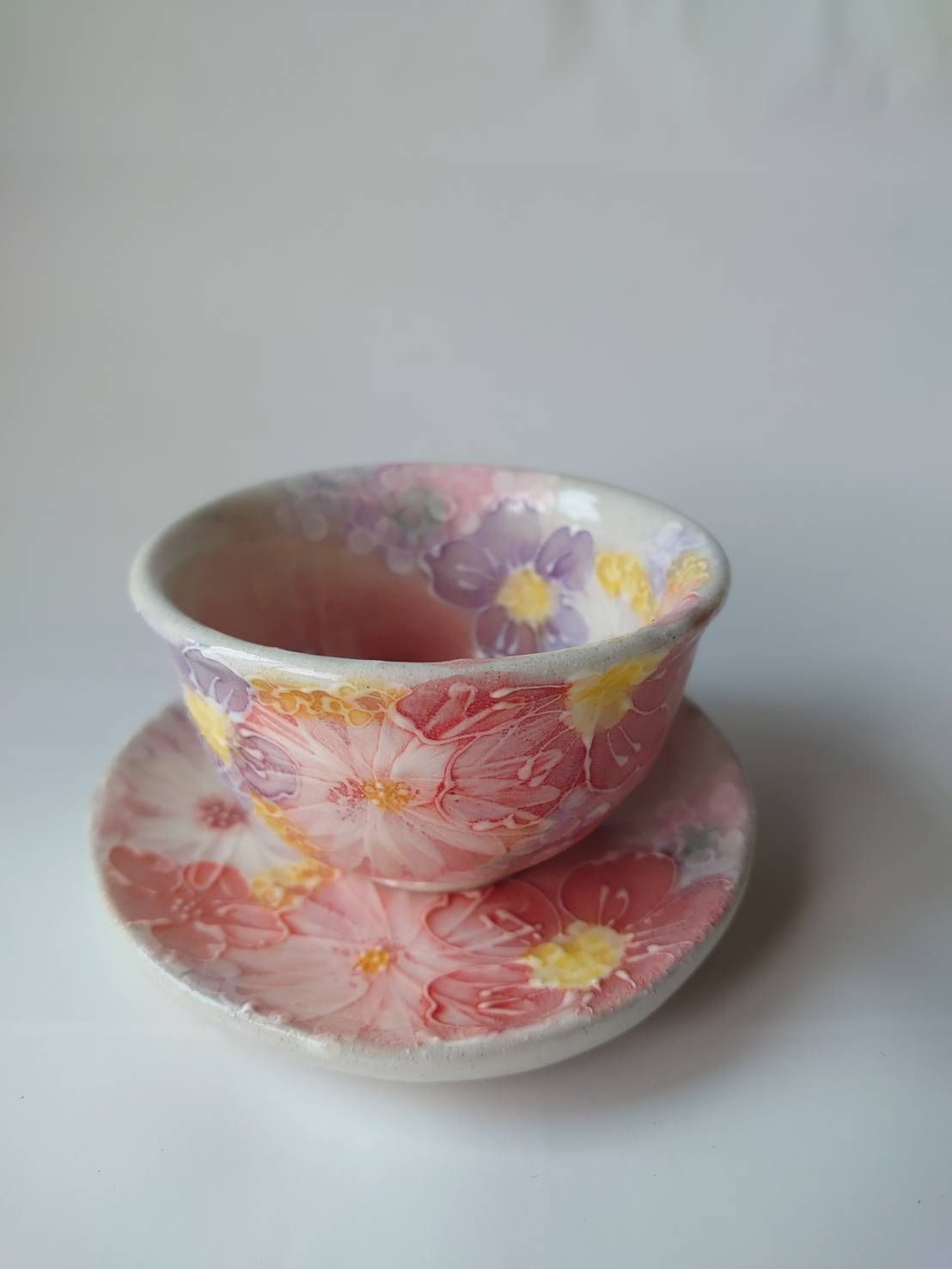 이 티 세트의 연보라색 꽃무늬는 매우 부드러운 분위기를 줍니다.