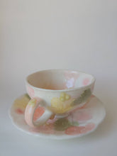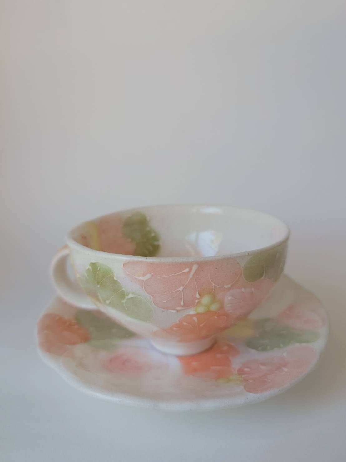 이 부드럽게 그려진 컵과 받침을 차와 간식 시간에 사용해보세요.