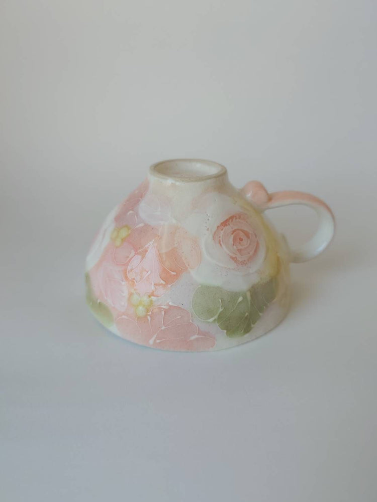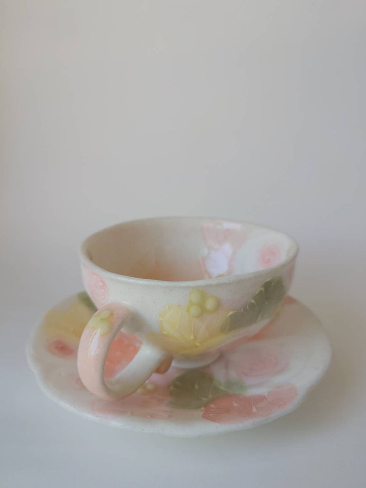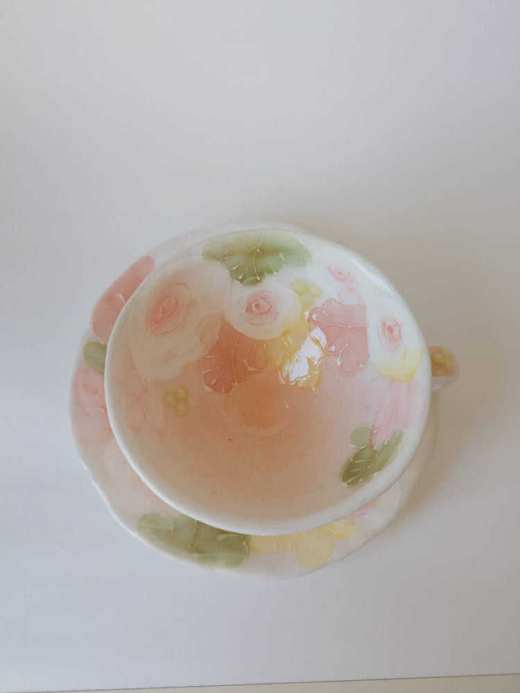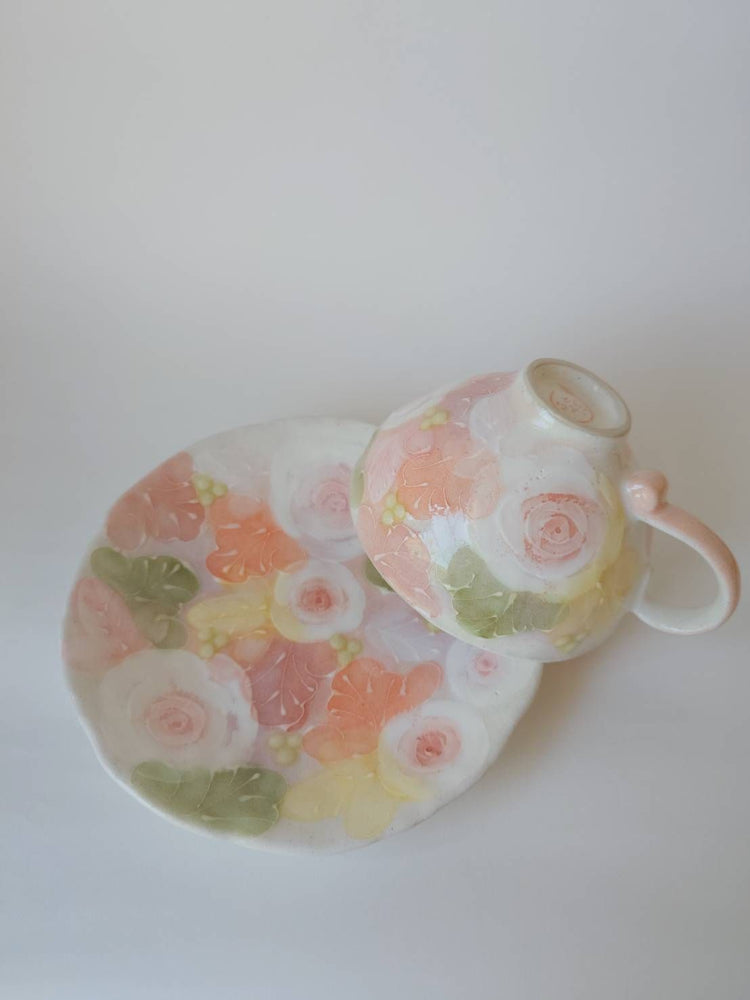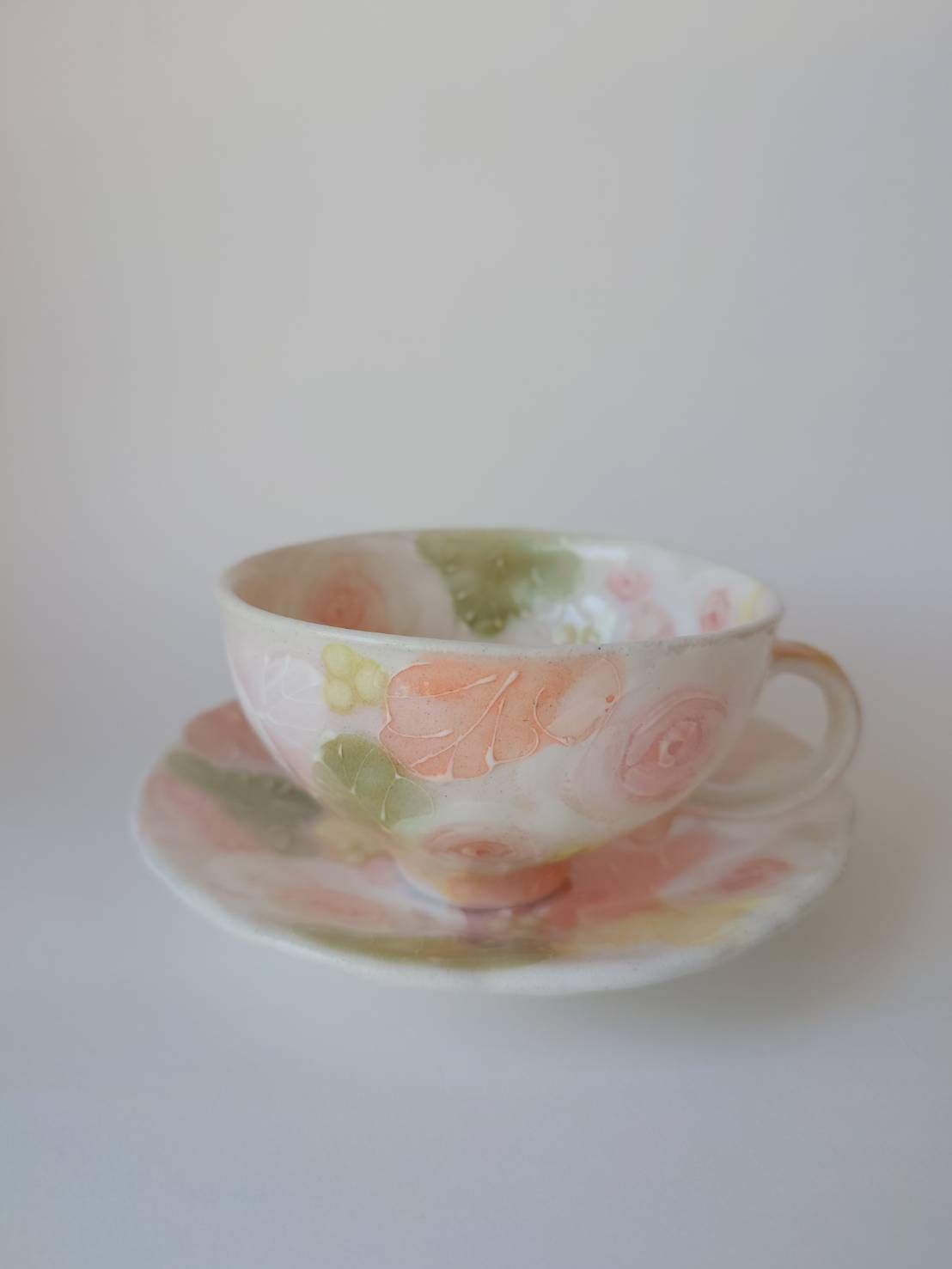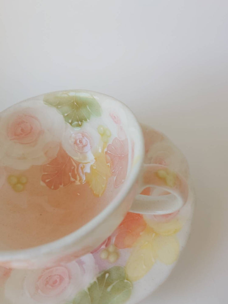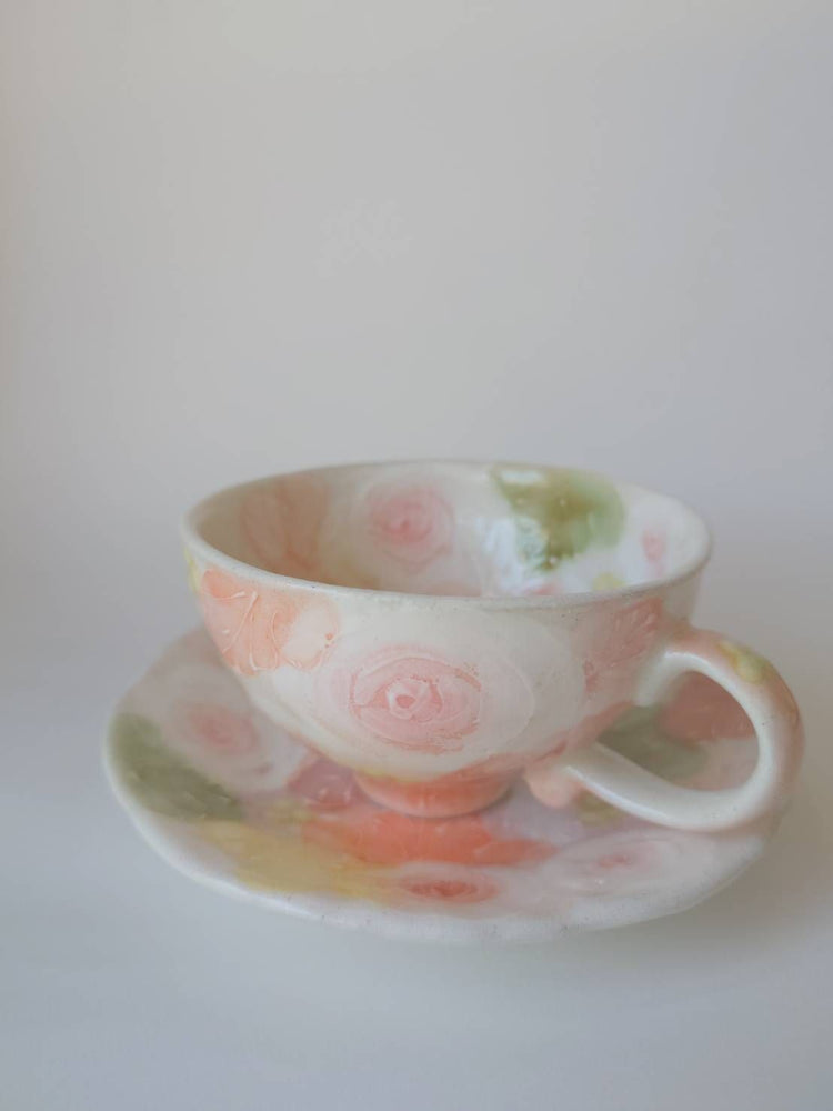 스튜디오 유즈리하 컵 & 소서, 아름다운 변형 핑크 장미, 유약 장미