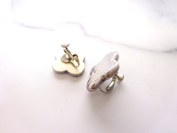 Clover Pierced earrings/Clip-on earrings with stripes painted in silver.