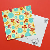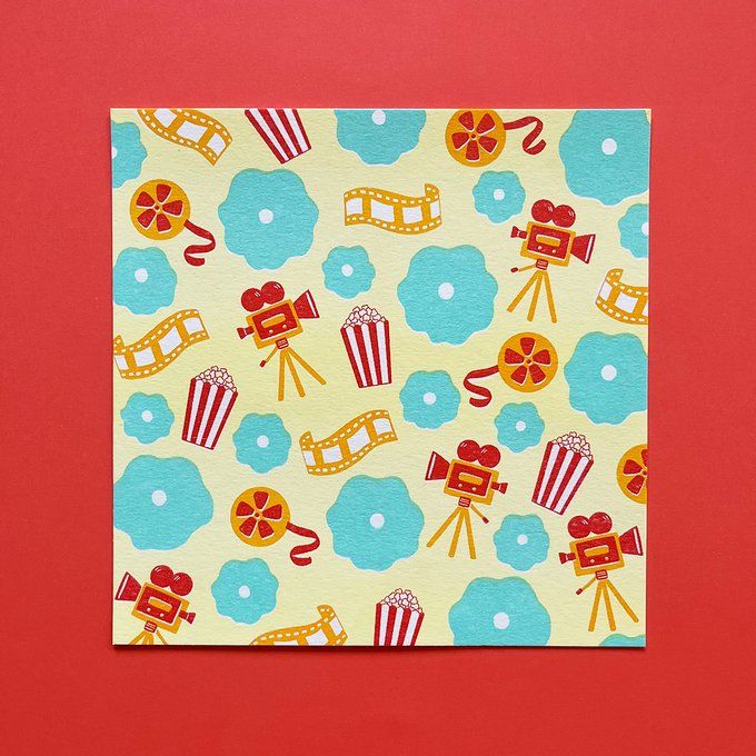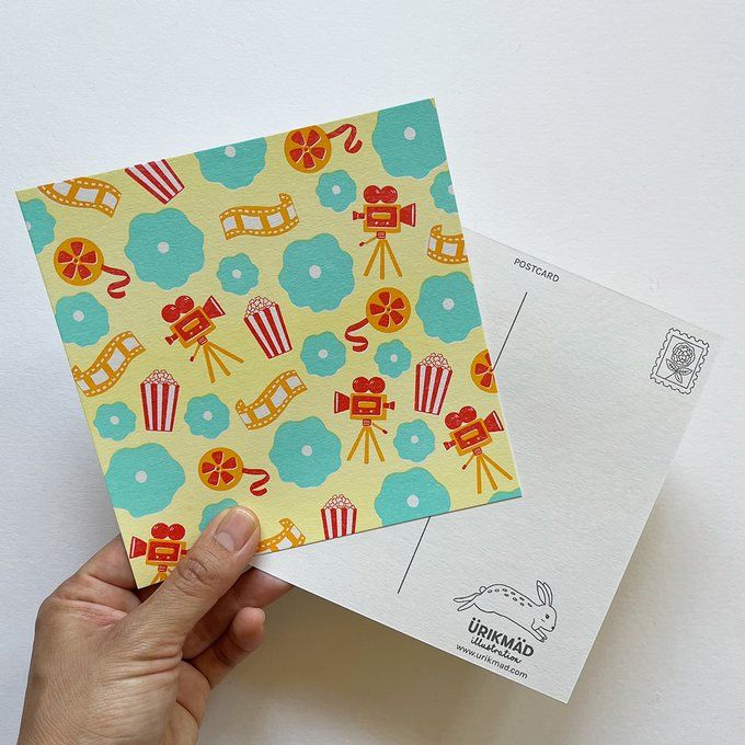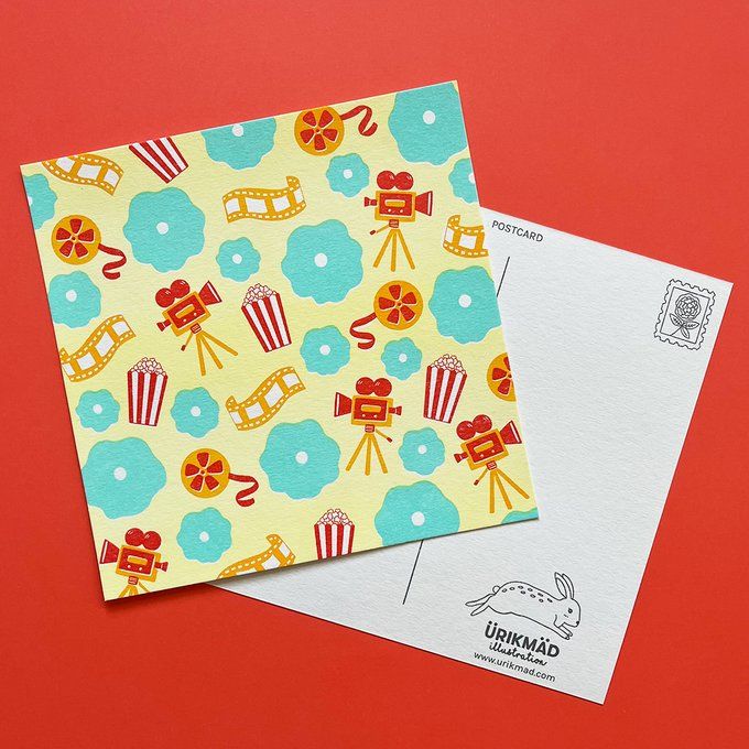 이 정사각형 엽서에는 영화 모티브와 귀여운 민트색 꽃이 그려져 있습니다!
