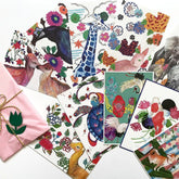 이 10장 세트에는 밤비, 까마귀, 기린, 토끼, 코끼리 가족, 임팔라, 바다거북, 학, 후지산, 덤불과 벚꽃, 잉어와 그림자가 각각 한 장씩 들어 있습니다.