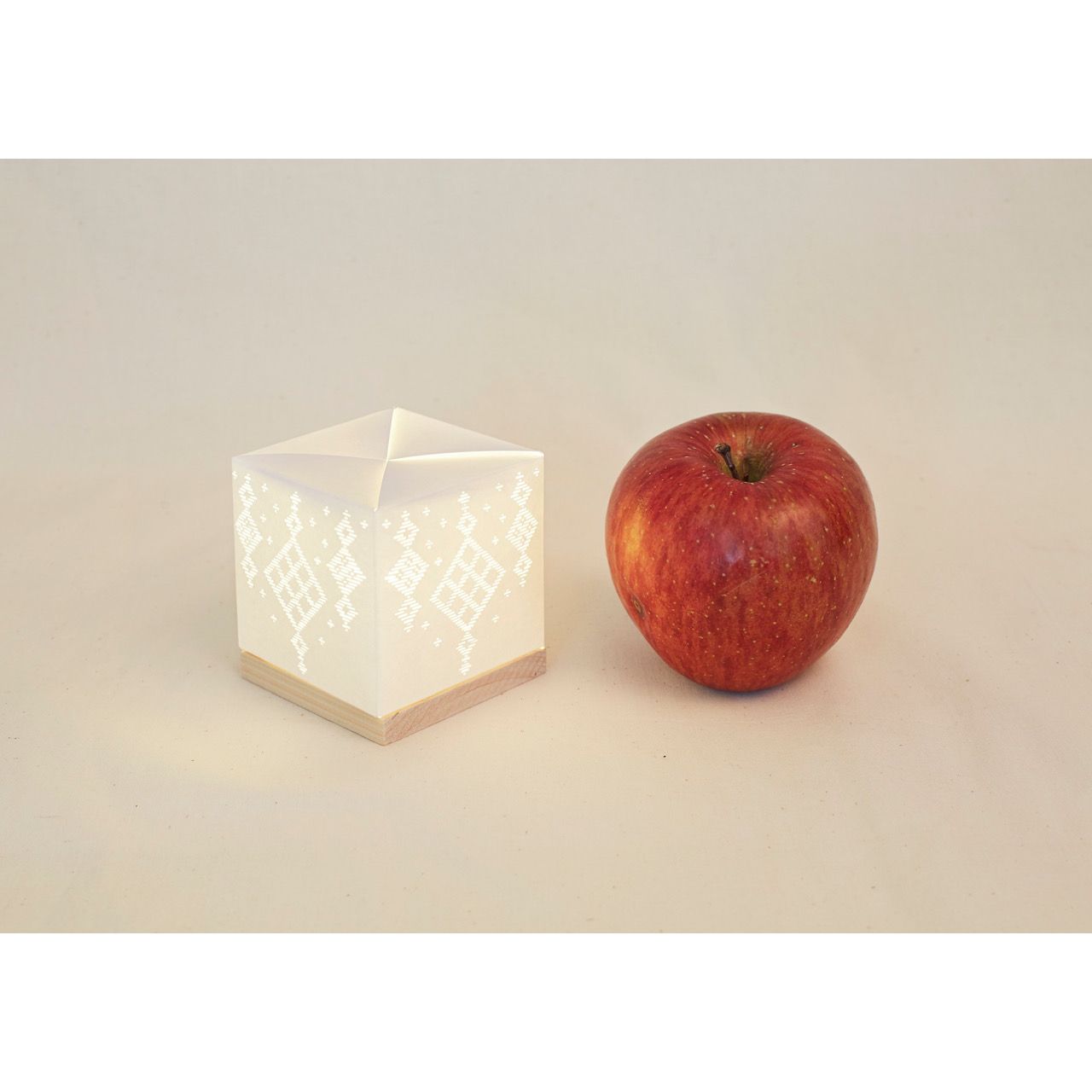촛불처럼 깜빡이는 배터리로 작동하는 LED 조명과 아오모리 히바(일본 편백)로 만든 받침대가 포함되어 있습니다.