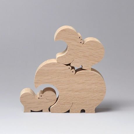 小黑三郎的木製組合作品的最小單位是用兩塊木頭製成的父母和孩子或一對夫婦。