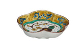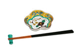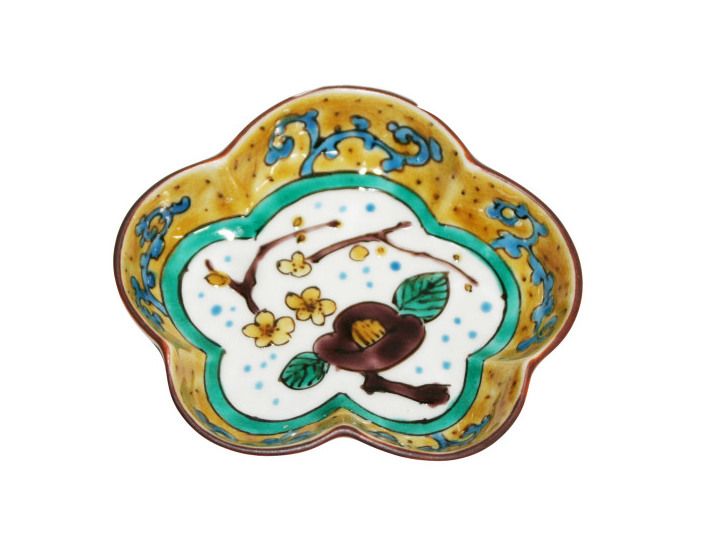 3인치 소나무 모양의 이 접시는 고구타니 양식으로 그려졌으며, 파란색 손잡이에는 동백꽃 무늬가 장식되어 있습니다.