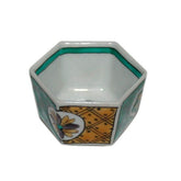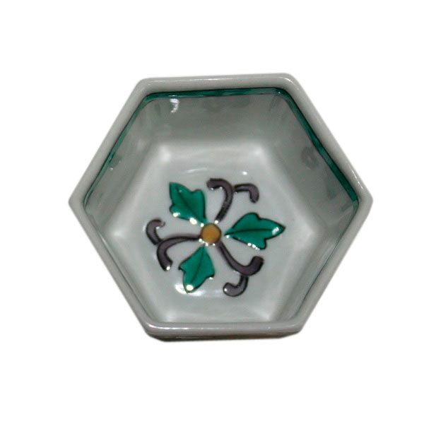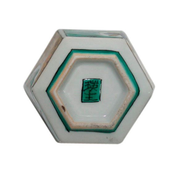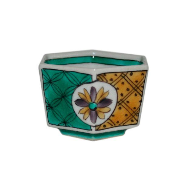 고야 구라요시를 존경하여 가마를 세운 요시다야의 작품은 부드러운 무늬를 띠고 있지만, 이 육각형 사케잔은 현대적인 기하학적 무늬를 표현하고 있습니다.