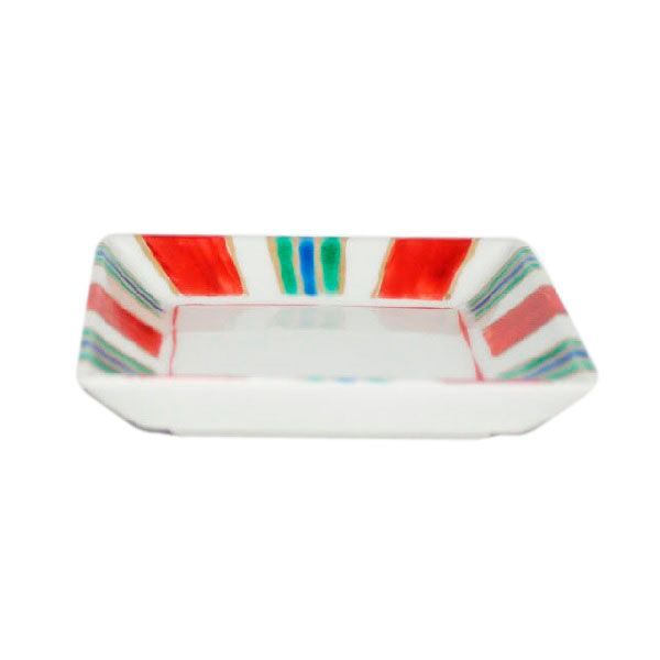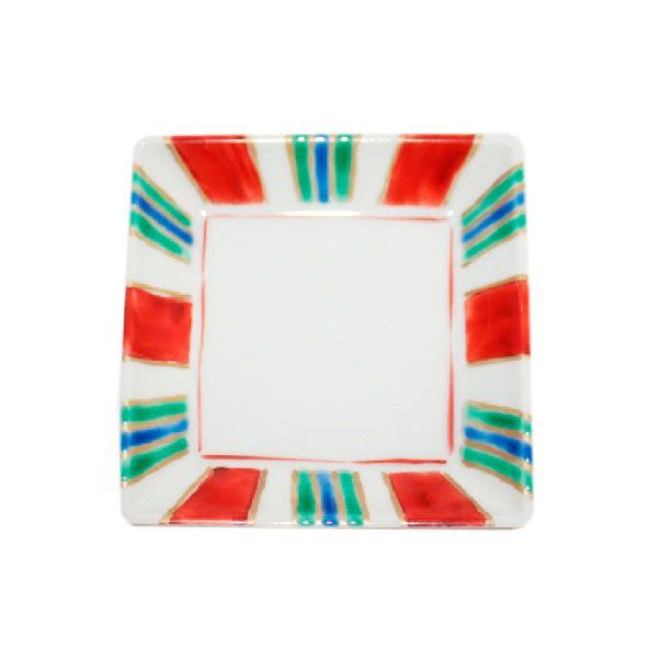 이 접시에는 히나단 장식처럼 화려한 줄무늬가 그려져 있습니다. 다리가 달린 6인치 접시도 함께 제공됩니다.