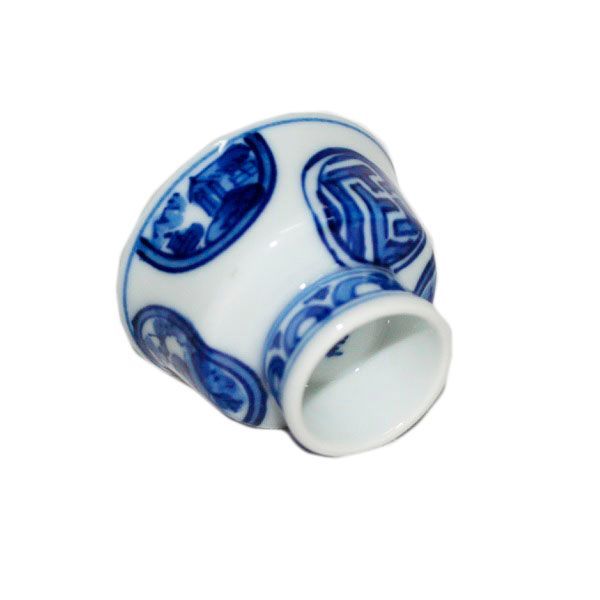 이것은 고젠즈케(옛날 청화백자)에서 흔히 볼 수 있는 원형 모티프입니다. 원 안에는 풍경, 낚시하는 인물, 그리고 기하학적 무늬가 그려져 있습니다.