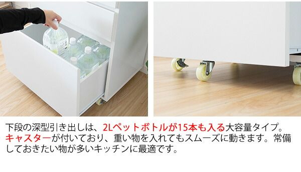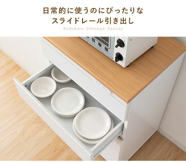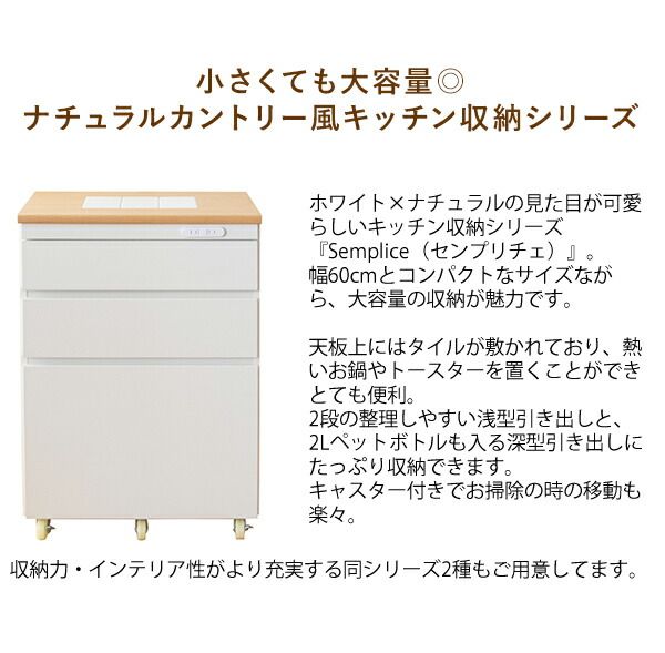 Semplice" is a kitchen storage series with a lovely white and natural look. It is attractive for its large storage capacity in spite of its compact size (60 cm wide).