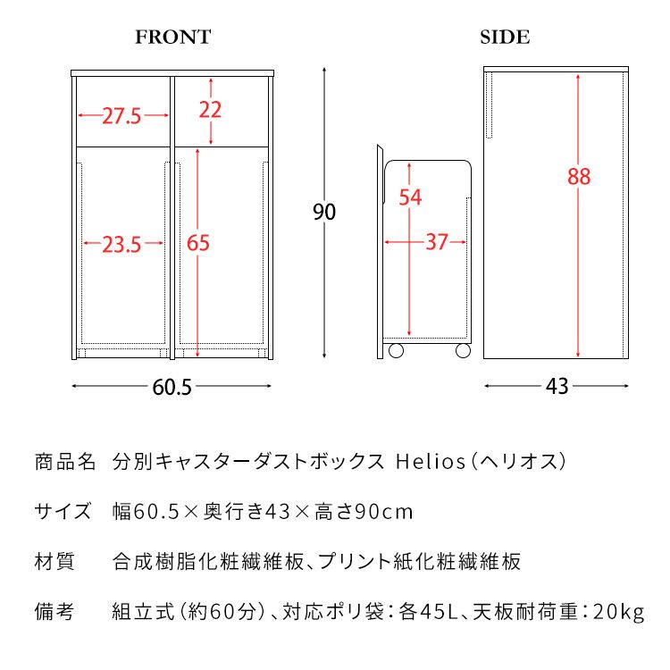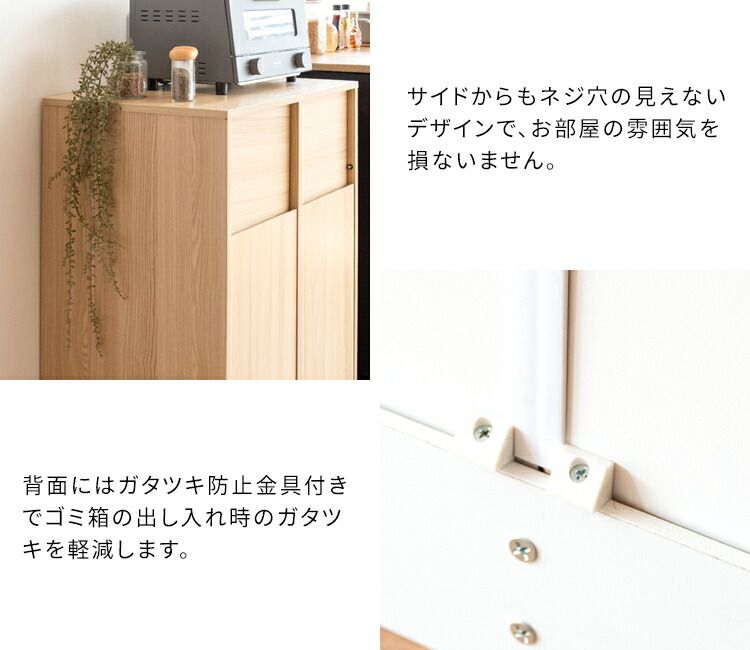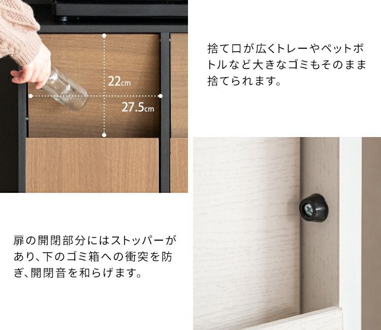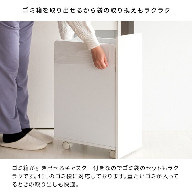 The push-door type prevents odors from leaking out and makes it easy to dispose of trash just by pushing the door. The dustbin is equipped with casters that allow you to quickly and easily move it to your hand, so you can take it out and pick it up right away when you are ready to dispose of the trash. Garbage bags are easy to put on and take off for convenience. The convenient two-bin system for sorting and the generous capacity of 45L x 2 makes it comfortable even for a large family.