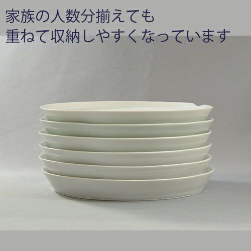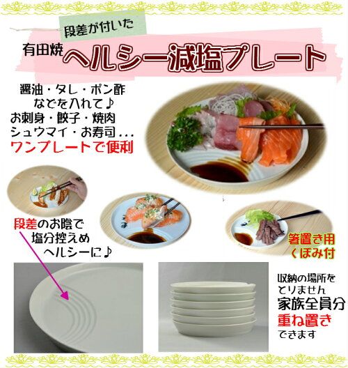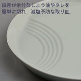 A round plate has an indentation to hold soy sauce, etc., and the border between the round plate and the plate is stepped like a staircase.
