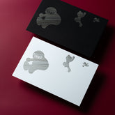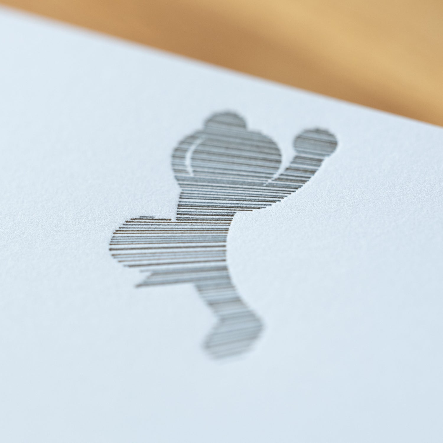 The three steps represent the movement of a person doing a broad jump with all his or her might. The fine straight lines that form the illustration are only 0.12 mm wide, and are clearly engraved in gold and silver ink on the paper by letterpress printing.