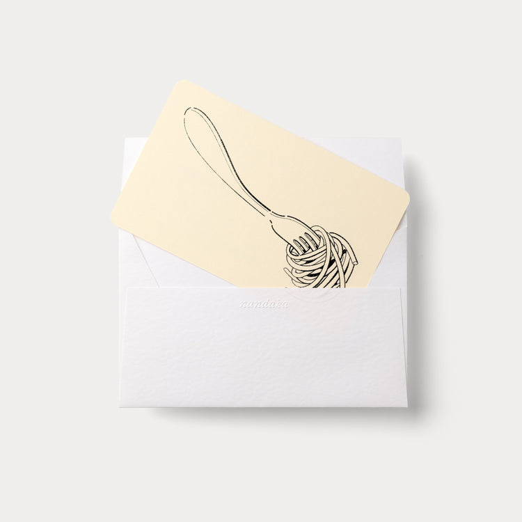 家居系列以家中陪伴您的事物為主題。這張卡片共有 20 種類型,其特色是用叉子包裹著一口意大利麵條。
